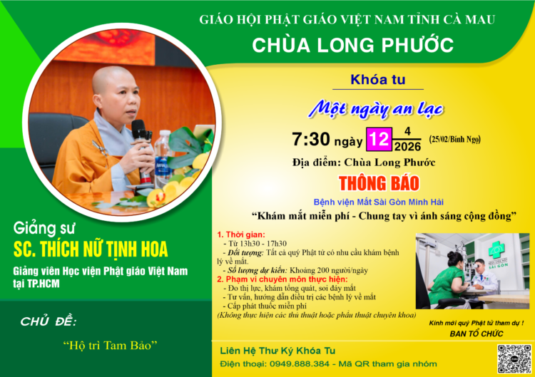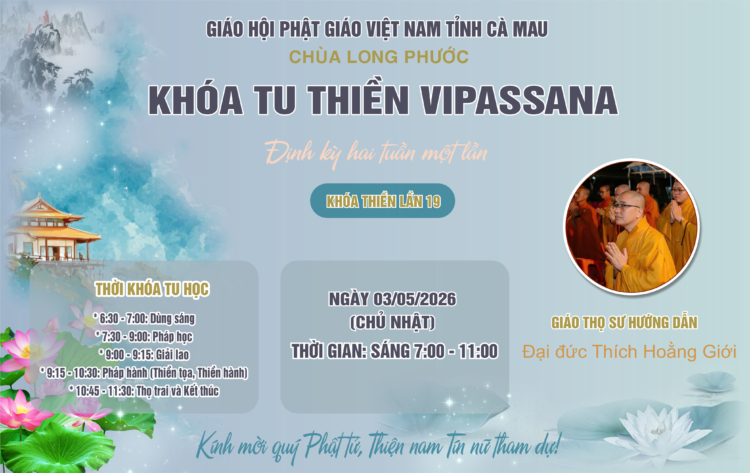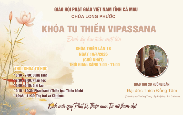 Xem tiếpSáng 19/04/2026, tại chùa Long Phước (phường Vĩnh Trạch), khóa tu thiền Vipassana lần thứ 18 được trang nghiêm tổ...
