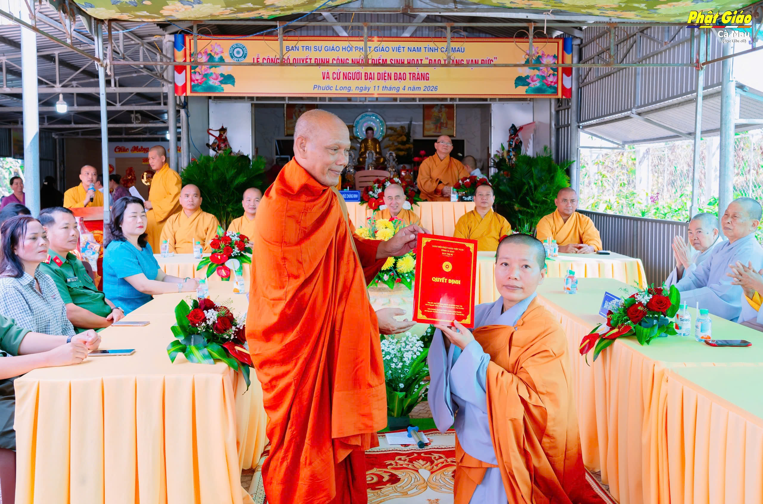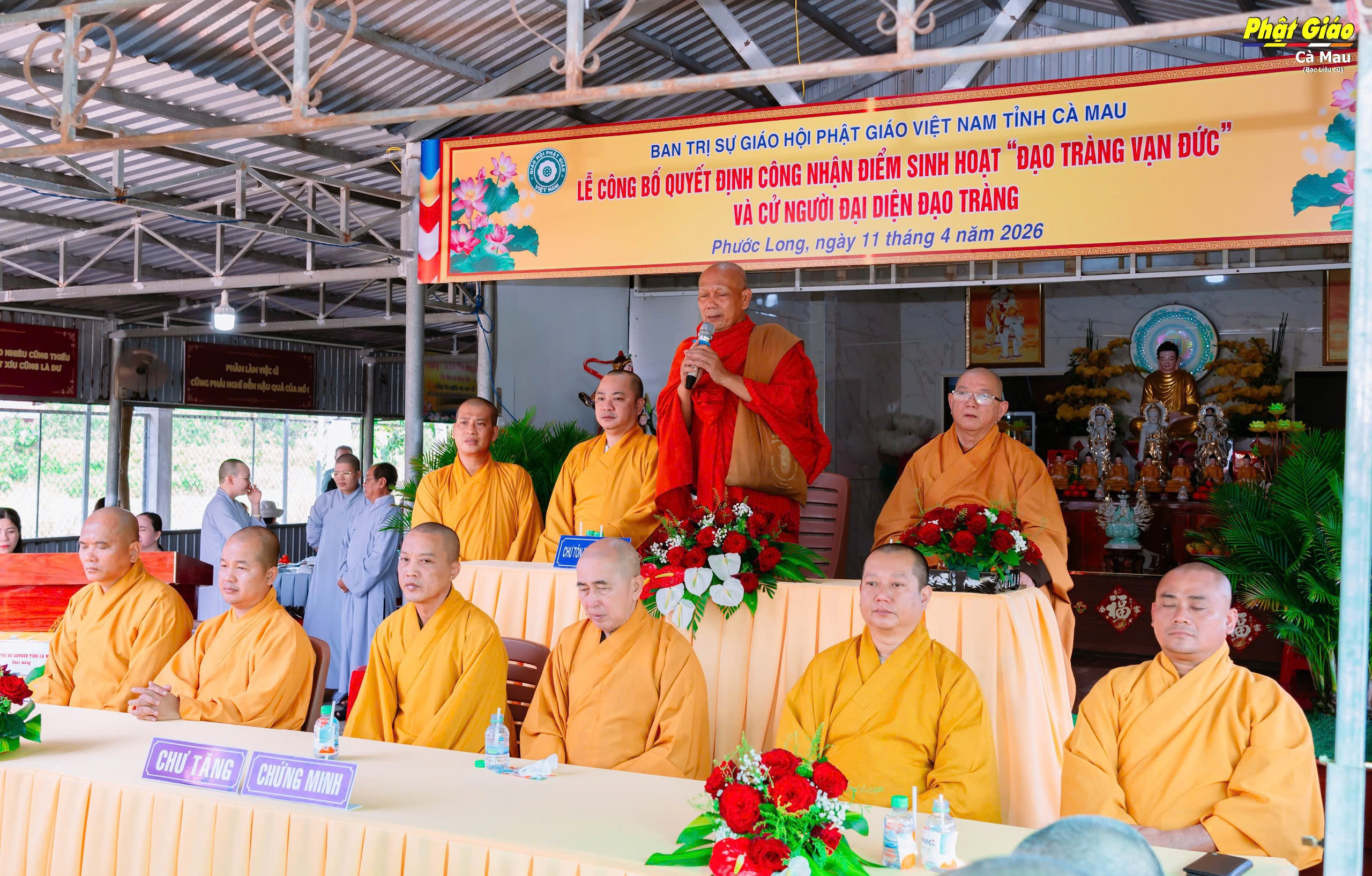 Sáng 11/04/2026, Ban Trị sự GHPGVN tỉnh trang nghiêm tổ chức lễ trao Quyết định công nhận và phân công người đại diện Điểm sinh hoạt tập trung Đạo tràng Vạn Đức, tọa lạc tại ấp Mỹ 1, xã Phước Long.